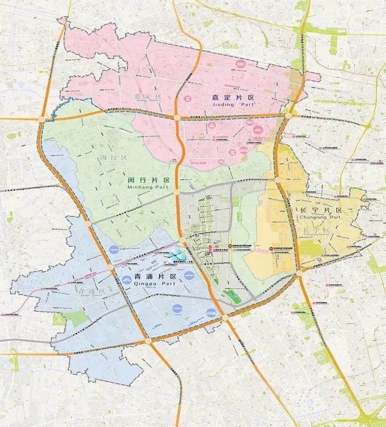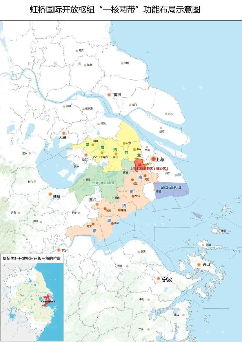 从空间来看,“一核两带”功能布局从苏南地区经上海市延展到杭州湾北岸,贯穿南北,总面积达到7050平方公里,其中上海市域包括嘉定、青浦、长宁、闵行四个行政区,面积达到2100平方公里,约占全市面积的三分之一。