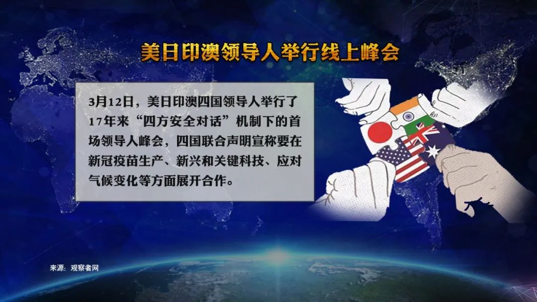 3月12日,美日印澳“四方安全对话”首次召开首脑峰会,虽没有点名中国,但牵制中国之心昭然若揭。