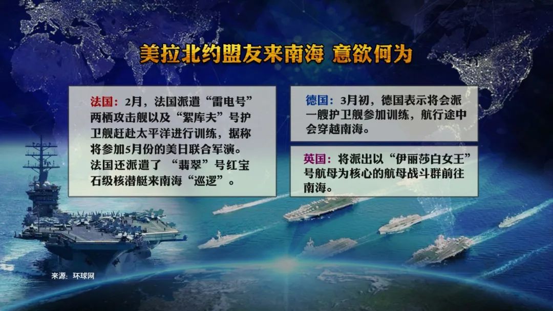 中美南海交锋升级,美国召集盟友,英法德三国出动兵力前来“助阵”。