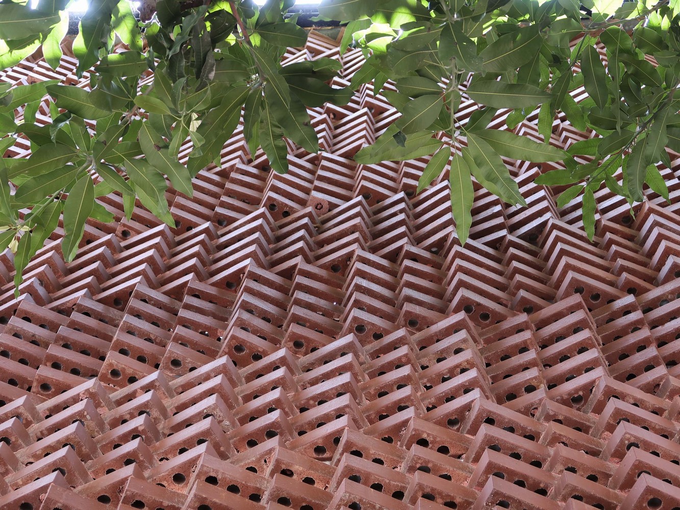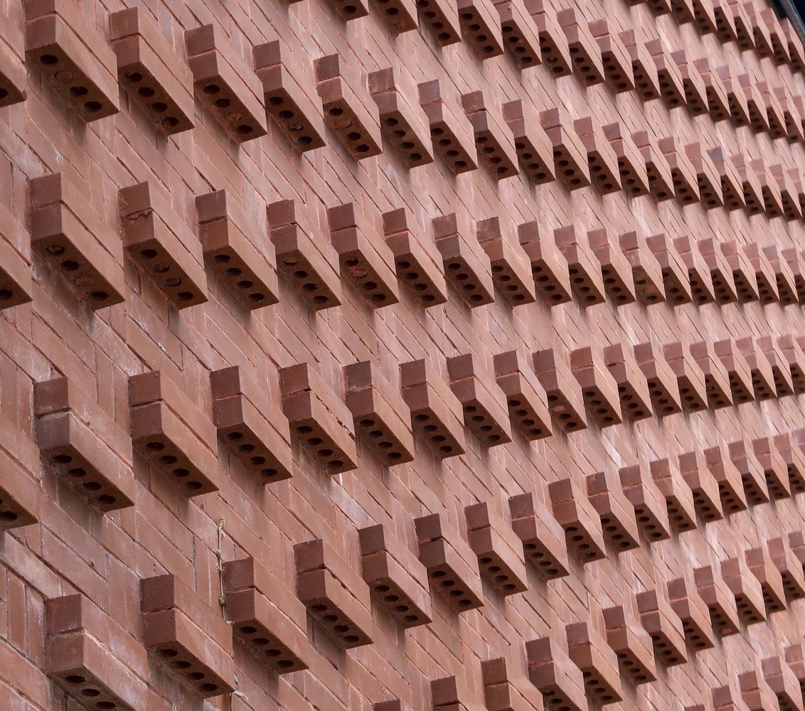外立面采用“砖砌法”,通过砖块方向的变换、镂空的砌法,设计出不同造型的立体几何立面,在保持外立面元素统一的情况下、兼顾了室内采光。