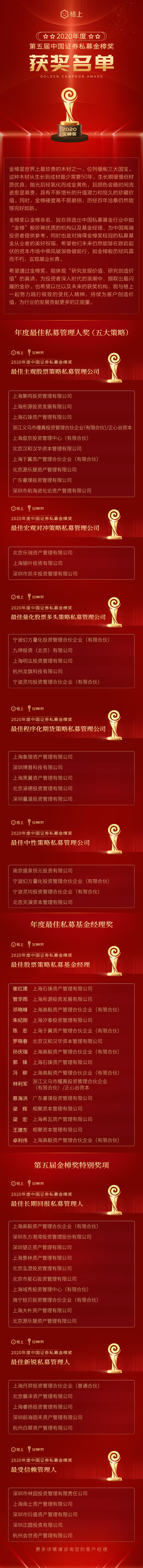 论坛期间,格上还揭晓了2020年度中国证券私募金樟奖的完整获奖名单,累计47家私募基金公司与15位基金经理,摘得了2020年度金樟奖,三大类九大奖项的荣耀桂冠。