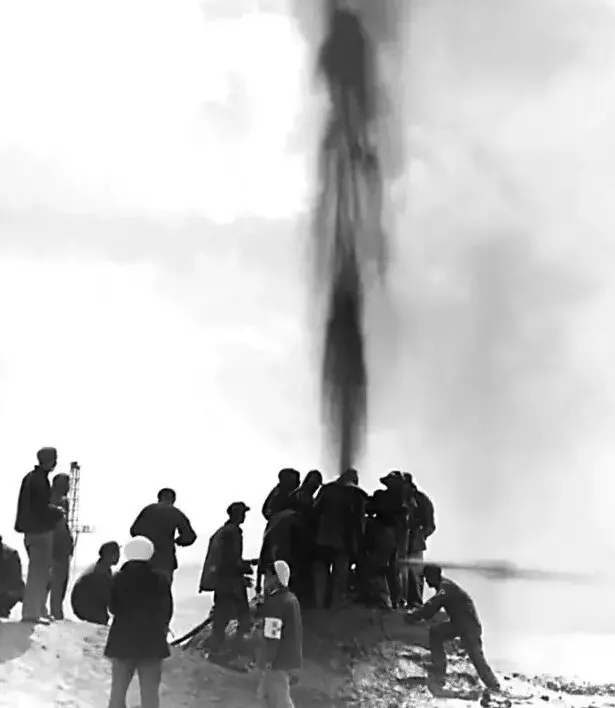 1958年9月13日,钻井队钻探柴达木盆地冷湖五号构造地中四井至650米时,先是出现井涌,继而发生强烈井喷,日喷原油800吨,三天三夜喷势不减,井场周围被喷成了一片油海,那时没有充足的储油设备,出井的原油一时拉运不出去,探区指挥部只好组织人员筑堤储油,将喷出的原油围堵成了一片“油海”。据说,当时,有一群野鸭从高远的蓝天飞来,误把“油海”当成湖泊,结果却被原油粘住了翅膀。