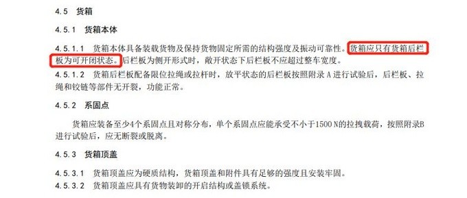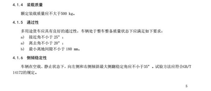 与此同时,在保证皮卡车宜商宜家属性层面,《多用途货车通用技术条件》除了对车身尺寸、载重量等参数提出限值外,还提出皮卡货箱应只有后栏板为可开闭状态,且后栏板为侧开形式时不应超过整车宽度。也就是说皮卡货箱不能三面开,此举也是希望皮卡与普通货车进行有效区分,充分发挥皮卡多功能属性,不让某些为微卡车型伪装成皮卡损害消费者利益。