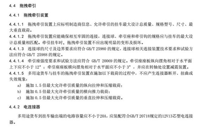 第三个,在多用途属性层面,明确规定了拖拽牵引装置的和电连接器的多项细节指标,这也是皮卡这类车型区别于乘用车和货车最为显著的一个层面,拖拽牵引标准的明确也将对皮卡整车的刚性和抗扭水平提出更高的要求,对于承载式车身或者没有梯形车架的车型来说,或将无法满足标准。例如,微卡式皮卡或某些承载式车身皮卡,便不能算作皮卡。