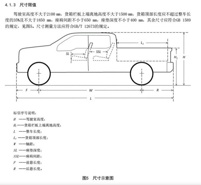 第二个,在舒适和安全层面提出,“座椅间距不小于650mm,坐垫深度不小于400mm”,明确区分乘用车、微卡、轻货之间的区别,避免假双排座椅的皮卡出现,进一步保证车内乘员的舒适性和安全性。另外,标准还在舒适性、平顺性等多个角度对皮卡进行界定,并对正面碰撞、侧面碰撞、前段保护装置等安全性标准提出约束,与乘用车现有的有关指标保持一致。