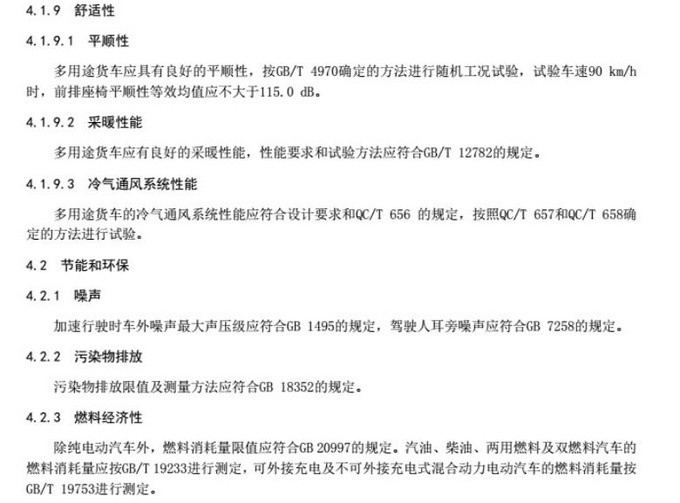 整体来看,《多用途货车通用技术条件》已经完全靠拢M1类车型标准,既座位数不超过9座的载客车辆。在标准和法规上有39项和M1类完全相同,为照顾皮卡与生俱来的部分货运瓶颈,仅在排放污染物、噪声、油耗等几处有所区别,但整体来看该标准已经将皮卡与乘用车标准看齐。