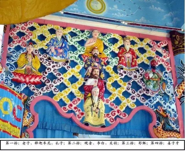 庙宇里,供奉来源于各个宗教的十多位神像,最高层中央是释迦牟尼,左右分别是老子和孔子,这是佛教、儒教和道教的始祖。二至四层分别供奉是观音、李太白、关公、耶稣、姜太公等。庙里还时常举行一些祭祀活动,热闹非凡。世事变迁,白云苍狗,恐怕游客们很难知晓一百年前这里曾风起云涌。