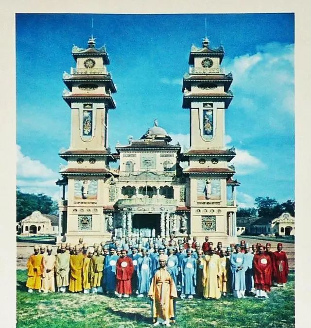 ▲位于越南西宁省西宁市高台教圣座大殿的高台教教徒,其中着黄衣、红衣、蓝衣者为祭司