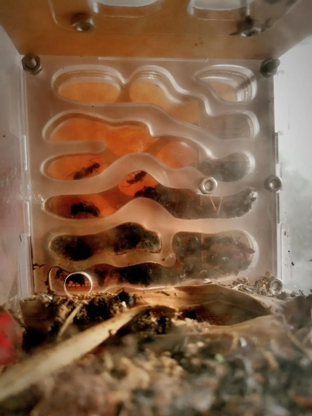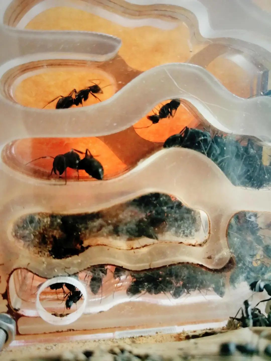 这些蚂蚁全是从淘宝上买的,饲养在用亚克力板做的人工蚁巢中,里面撒上泥土,另外再留出一块活动空间。