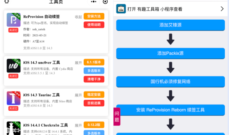直接前往【有趣工具箱】小程序,找到ReProvision【安装方法】,接着跟着步骤操作,千万不要跳过,每一个细节都能解决大部分问题。
