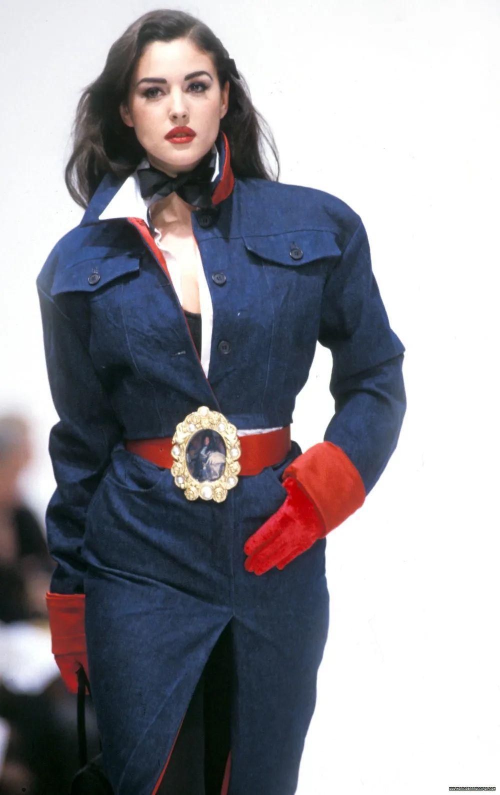 在模特界,身高1米73的莫妮卡·贝鲁奇,说句实话根本算不上10分的出彩,但是每当她出场的时候,却给人一种身高2米8的气场感,那个时候的莫妮卡·贝鲁奇在T台上走秀简直美炸了,不管是穿牛仔连衣裙搭配黑色丝袜,还是烈焰红唇装扮直接会把你迷的不要不要的。