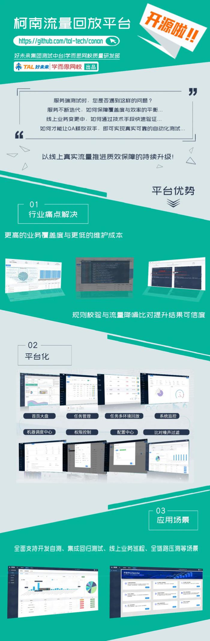 开源后的柯南流量回放平台是一个前后端分离的Java EE企业级流量回放平台,基于平台配置化的方式,大幅降低了接入难度及使用成本,并降低了使用者的技术门槛。相较于其他行业,教育行业的业务场景更加复杂多元,测试部署难度更大,基于此提取凝练出的柯南流量回放平台在满足教育场景需求的同时,也能灵活应对各行业场景服务端测试的广泛需求。