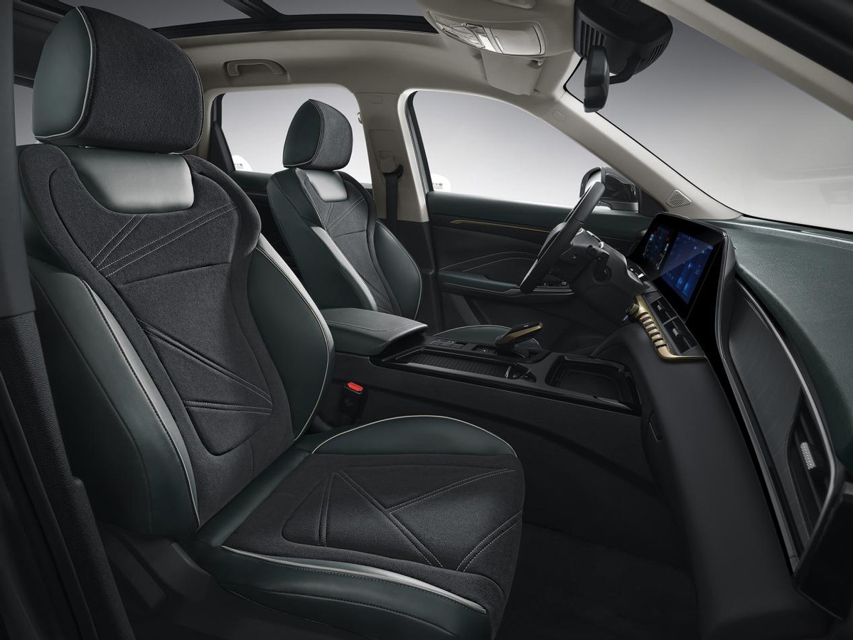 整车采用“光影哲学之性感曲面”设计语言,流动线条,体现光影之美;家族式数码雨滴进气格删透射出强烈的未来感、科技感与都市气息;三维立体LED戈型前后大灯,点亮之后,视觉冲击力强,整体辨识度极高;车内无帽檐双12.3英寸高清液晶双连屏,方寸之间提升档次、优于同级,构成科技感满满的贯穿式曲面屏视觉效果,且功能分布一目了然,便于驾驶者操作;水墨绿清新内饰,设计灵感源于传统文化中的竹林,打造满满“国潮”气息,为用户营造“置身青山绿水,舒享国民雅乐”的清新驾乘环境。