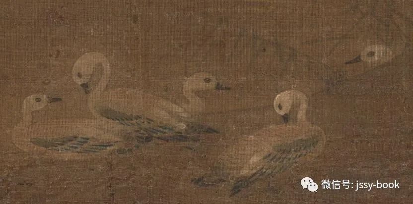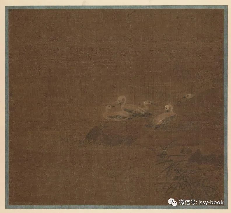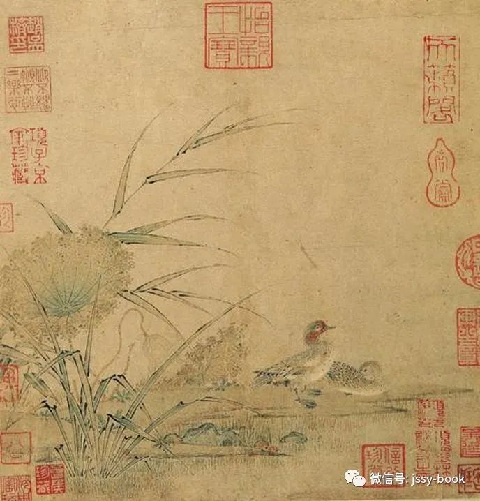 《秋浦双鸳图》,册页。纸本设色。27.4×26.4cm。台北故宫博物院藏。前景绘芦苇败荷,中景绘鸳鸯一双栖于岸上,远景为岸际及天空。全画景与情紧紧地结合,给人一种秋天虚旷潇洒的气氛,具有诗的意境。画面中或用勾勒,或用点染,造成质感上的对比,进一步丰富了花乌画的表现力。