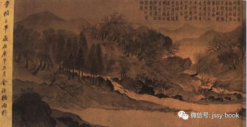 溪山春晓图,长卷,绢木,纵24.5厘米,横185.5厘米,北京故宫博物院藏。此图描写的是江南平远景色。卷首是山溪,水中有四舟。水中各种水禽甚多。对岸柳树、桃树及杂树、水边丛草,远山数重。画的左半偏中部分伸出一个山岗、渚滩,卷末是从山中流出的溪水,溪水之左又是城坡。山坡上都长满了绿柳红桃和各类杂树,一片江南春色。此画山石用墨较浓,画树特别精致,杂树用笔点簇而成,柳树以方直线条勾出老干,然后丝出柳枝条,最后再染汁绿色。桃花用红白二色点出,至今犹艳。