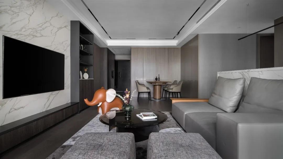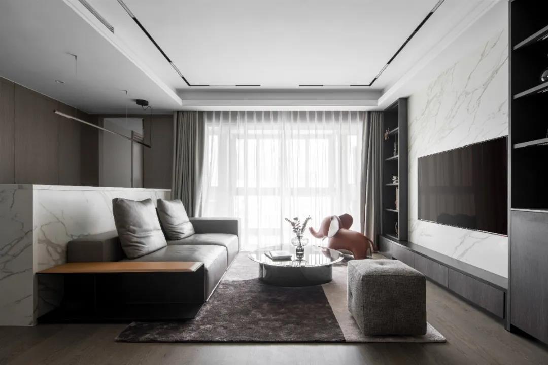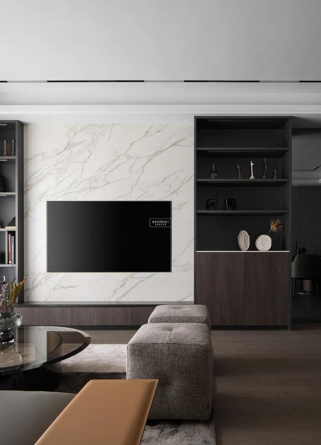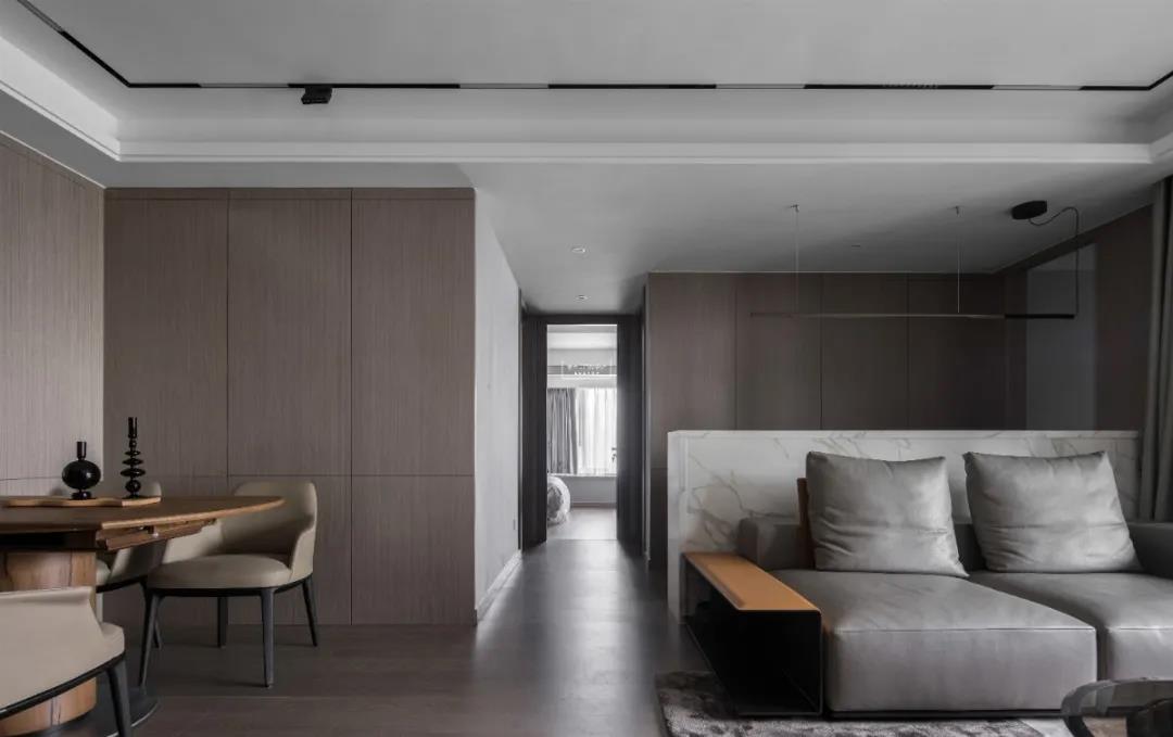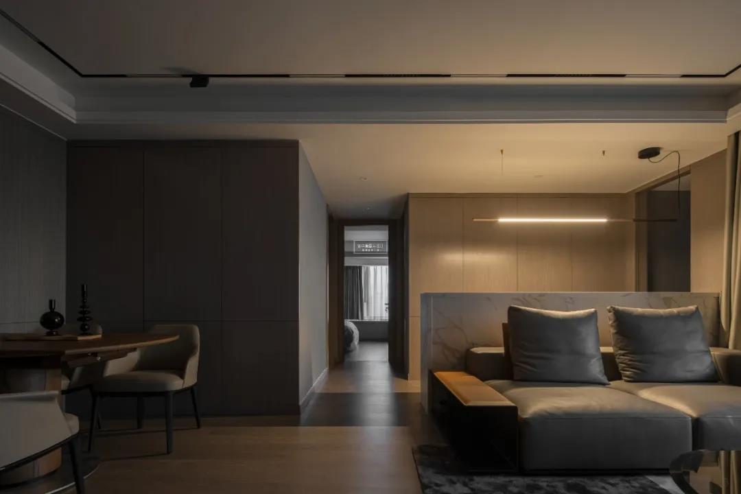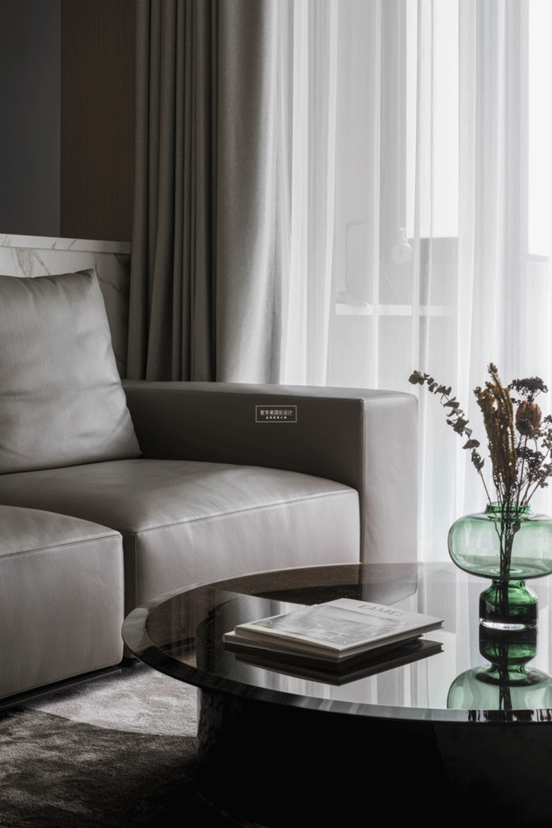 整体颜色高冷而材质则温暖柔软,明度分明的色块营造硬装上的冷清感,而温润的木材、柔软的皮革、布艺等材质点缀着温暖,平衡柔和了整个空间质感与格调。
