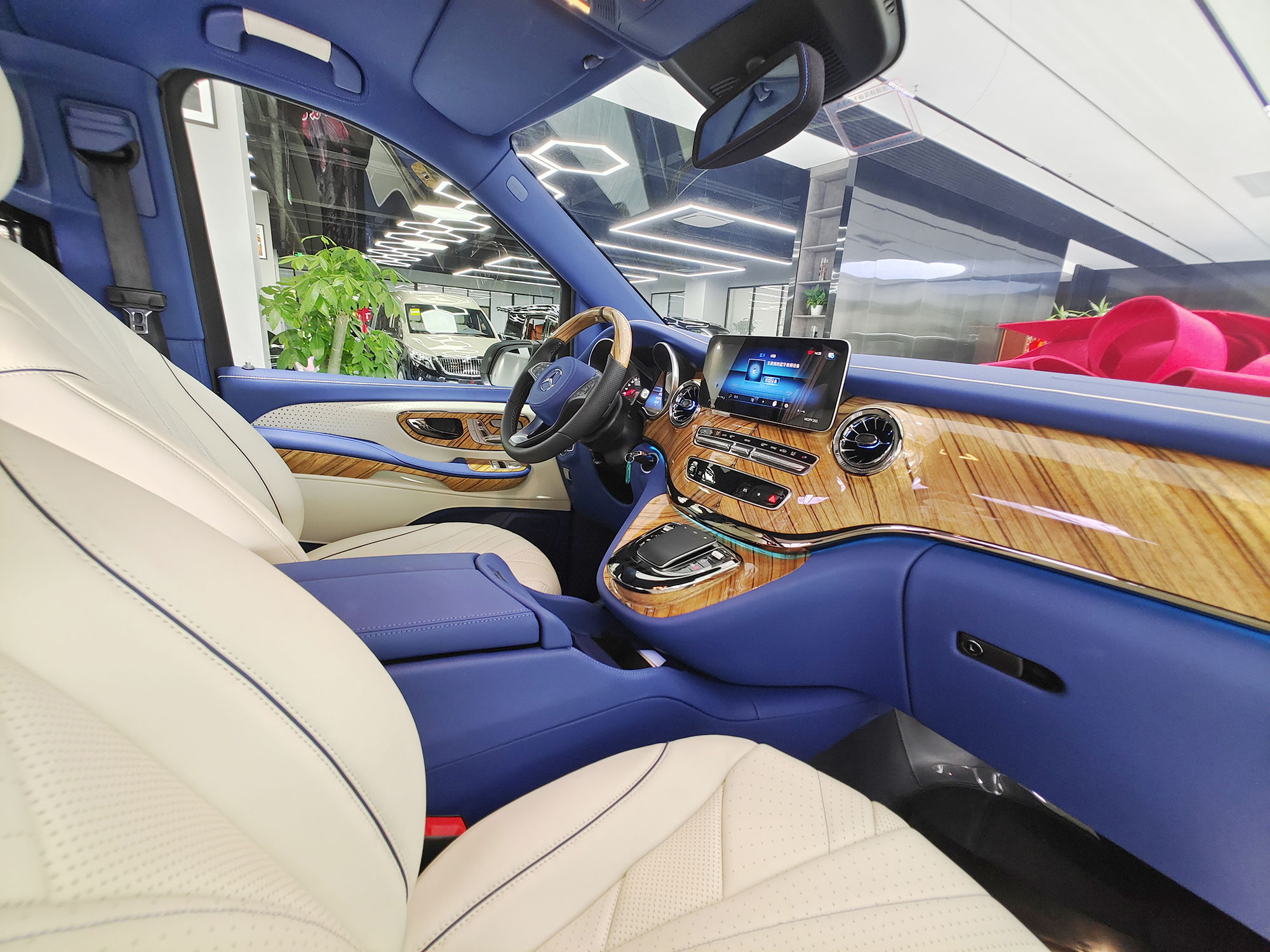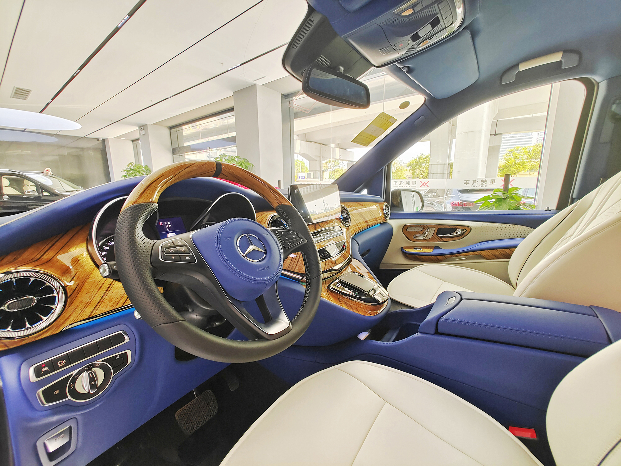 进入双色奔驰V级的驾驶舱,你很难抗拒这样奢华的质感。蓝白色拼接的真皮座椅,一体式中控台桃木包覆,连多功能方向盘也是真皮与桃木的拼接,握感非常好。