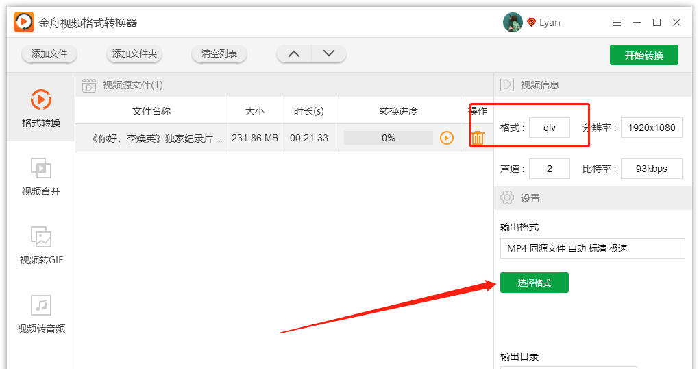 第三步、如图,qlv视频添加进来后,点击“选择格式”;
