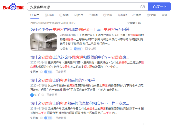 当下,假如你用百度搜索“安居客假房源”可以搜到3480万条结果,几乎全部都是对安居客的指责。