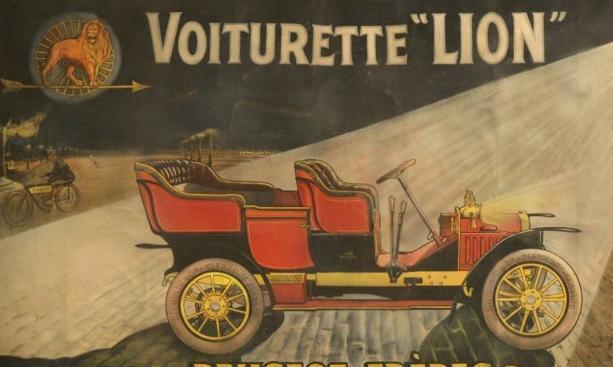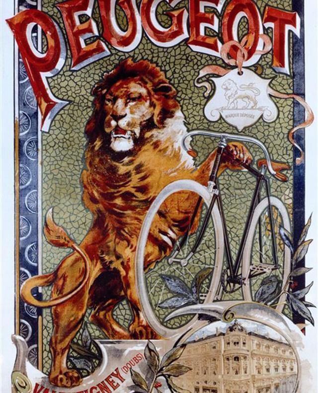 四年之后,这款自行车使用了链条传动,标致自行车开始批量生产。从这张海报上可以看到,狮子占据了非常醒目的位置。