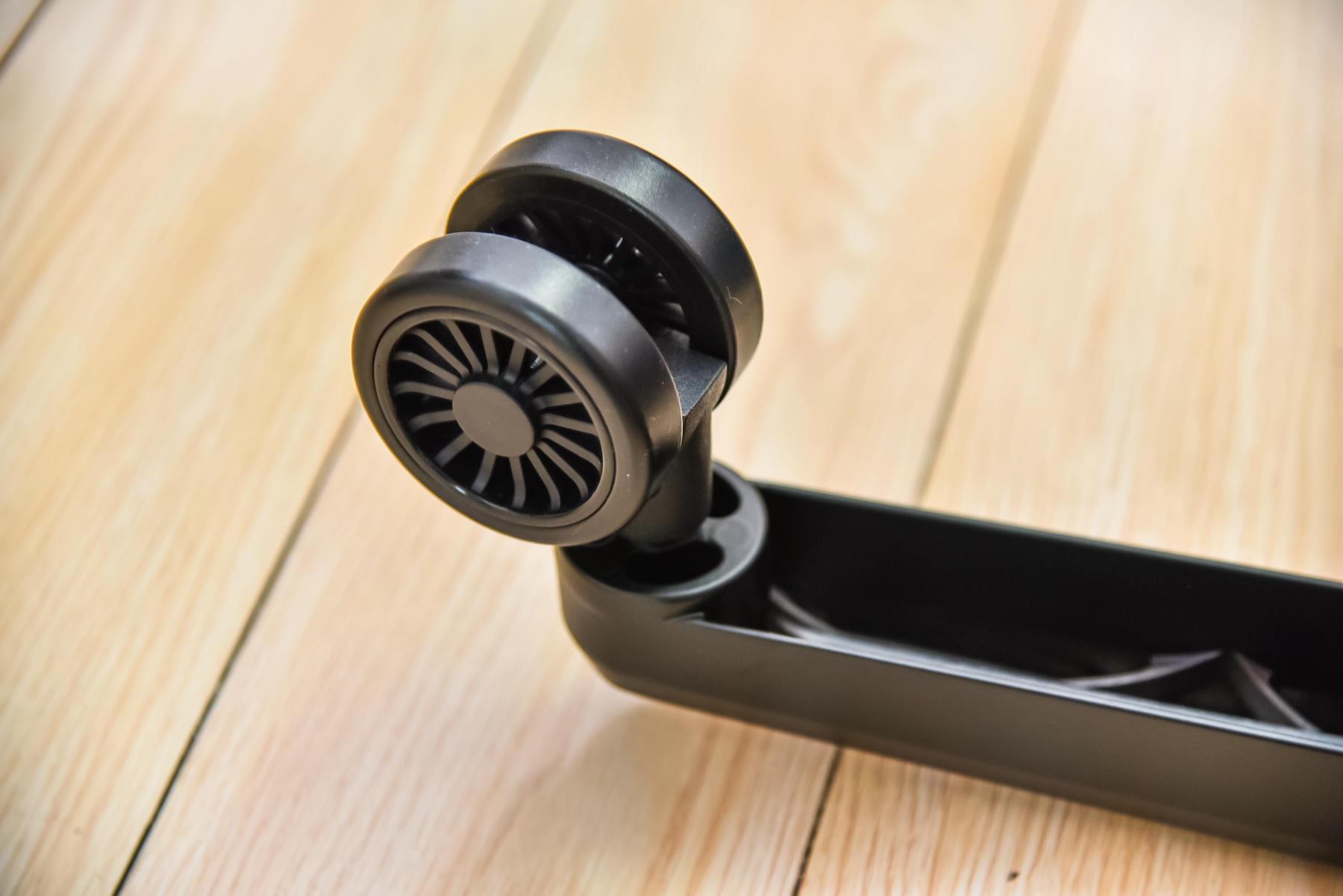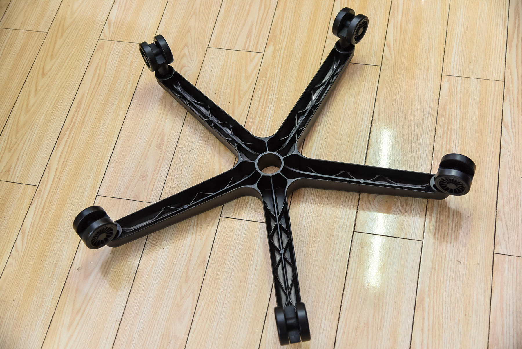 先把五星脚倒置放在自带的内包装材料或是较软的垫子上,然后五个万向轮依次拧好,这个很简单,就是需要下点力气拧紧,毕竟要是没拧紧,一不小心一屁股坐在地上就不太好了。摔倒事小,把身体摔着事大。