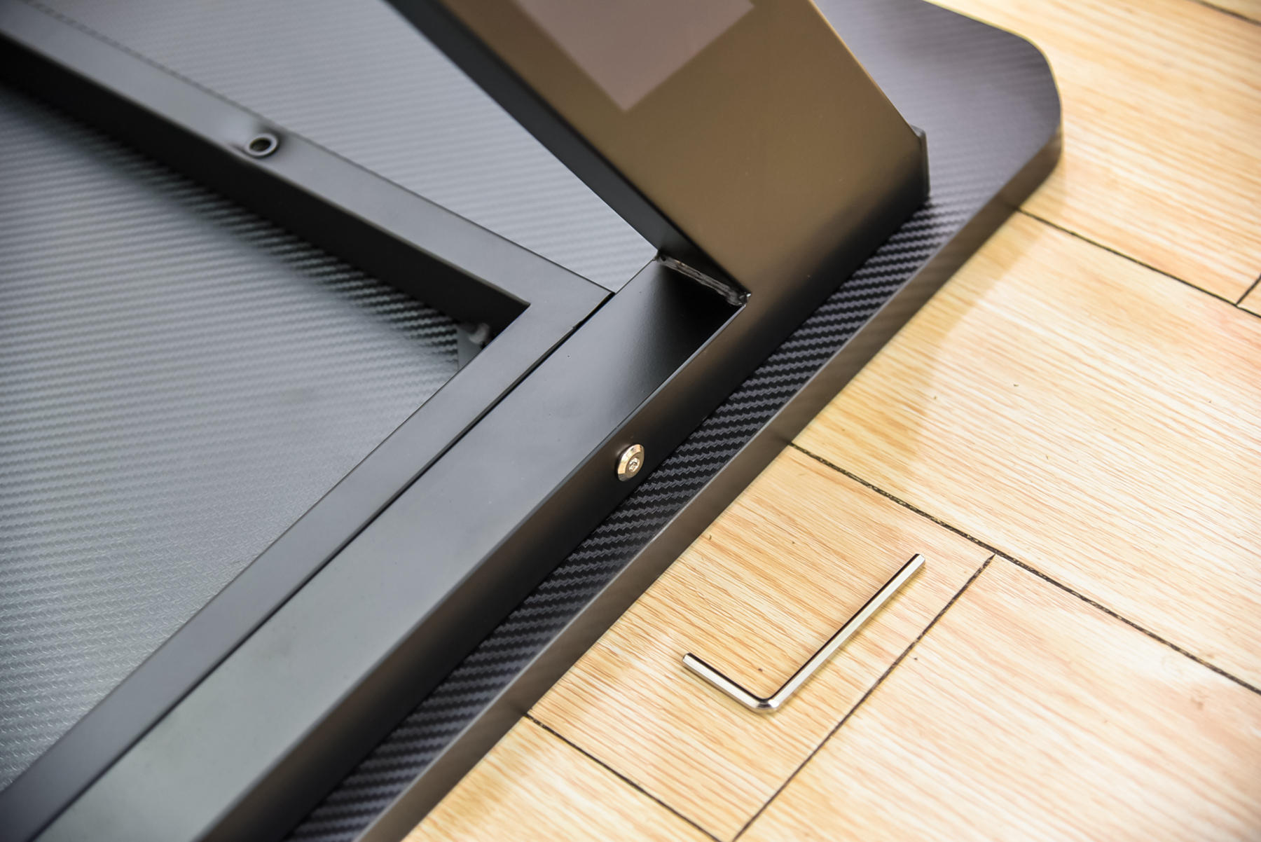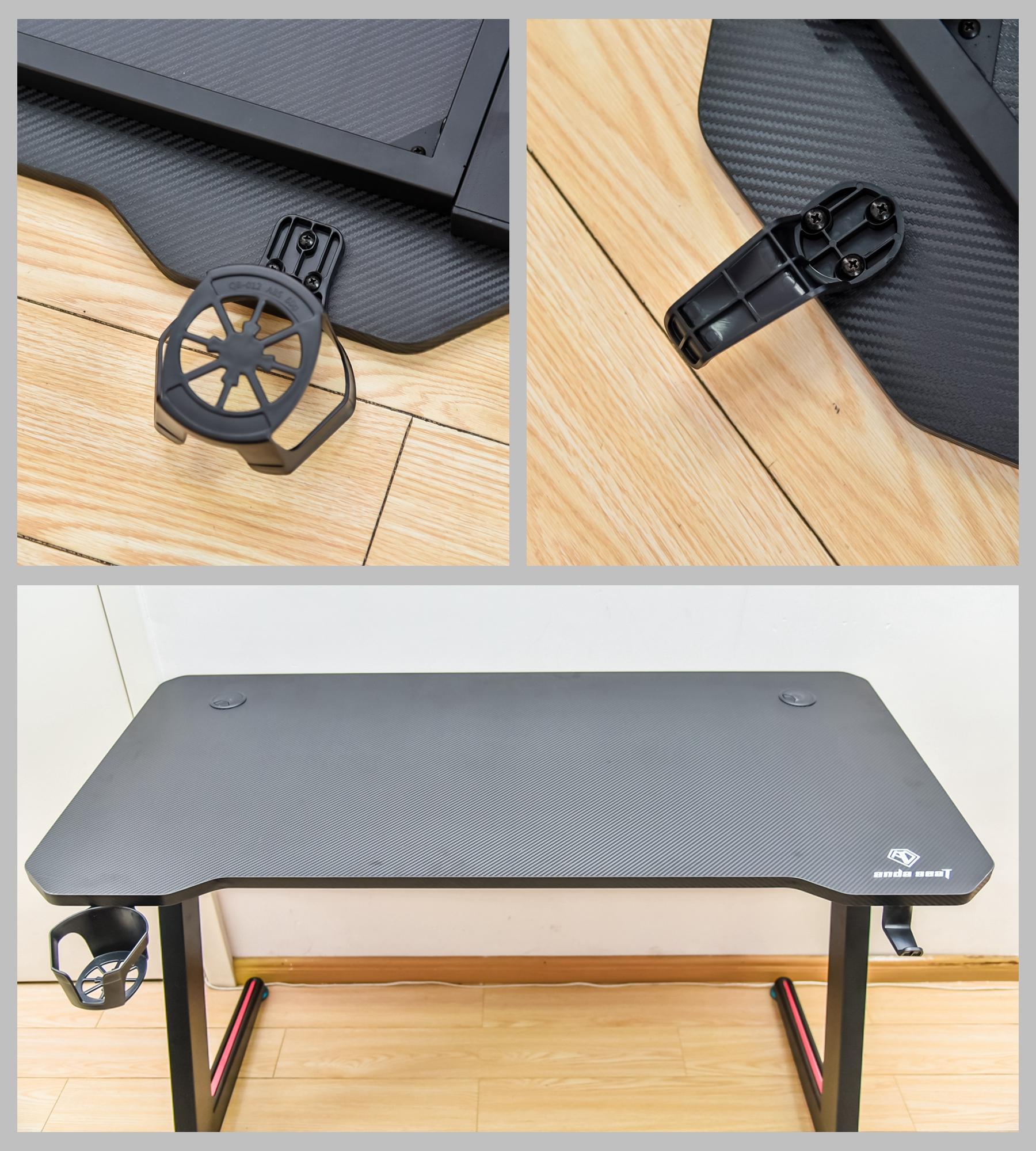正面底部,左右两侧也是两个支架位,同样是螺丝对好位,拧好就可以,简单操作。桌面的大小也是一个标准的120cm*60cm大小,无论是办公还是游戏,完全足够使用。