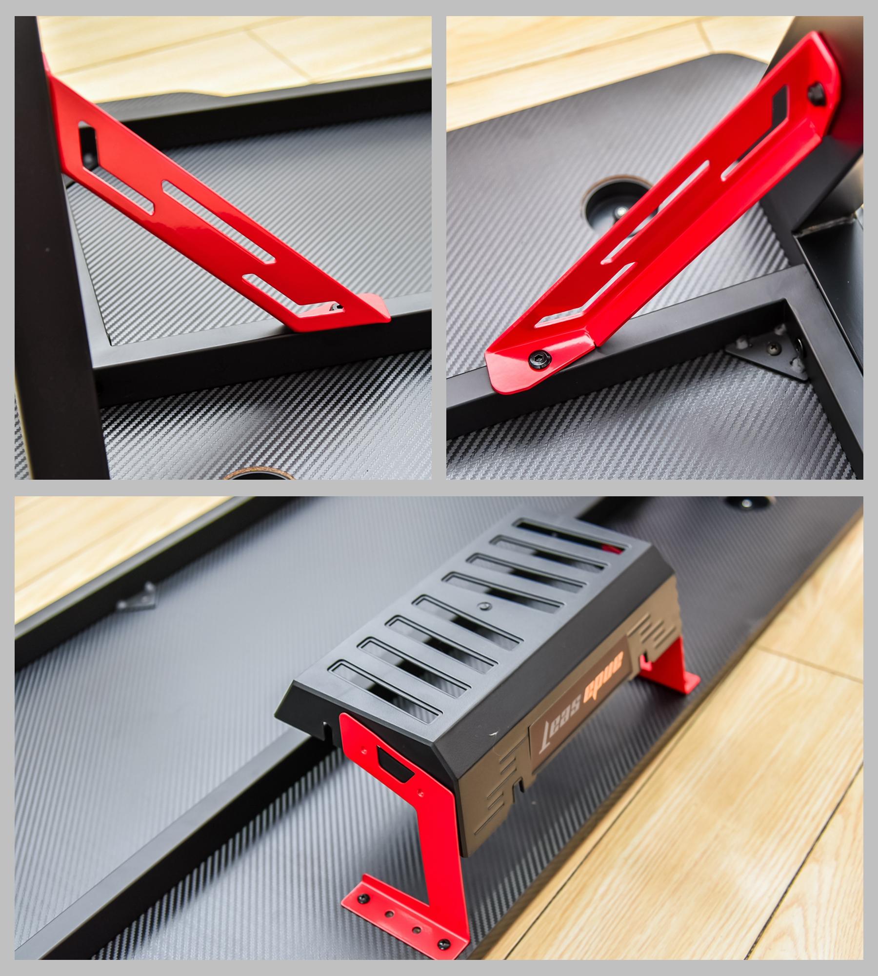 翻到底部,除了左右之外,机甲战士电竞桌的中间部分也是需要一个辅助支撑的,众所周知,三角形是最稳定的结构,做左右两边的桌腿和中间支架的连接处加一个支架组成三角结构,稳上加稳。桌板下方还有一个专门用来放置线材或者放置插线板的收纳盒,对于我这种强迫症患者来说简直不要太好用。
