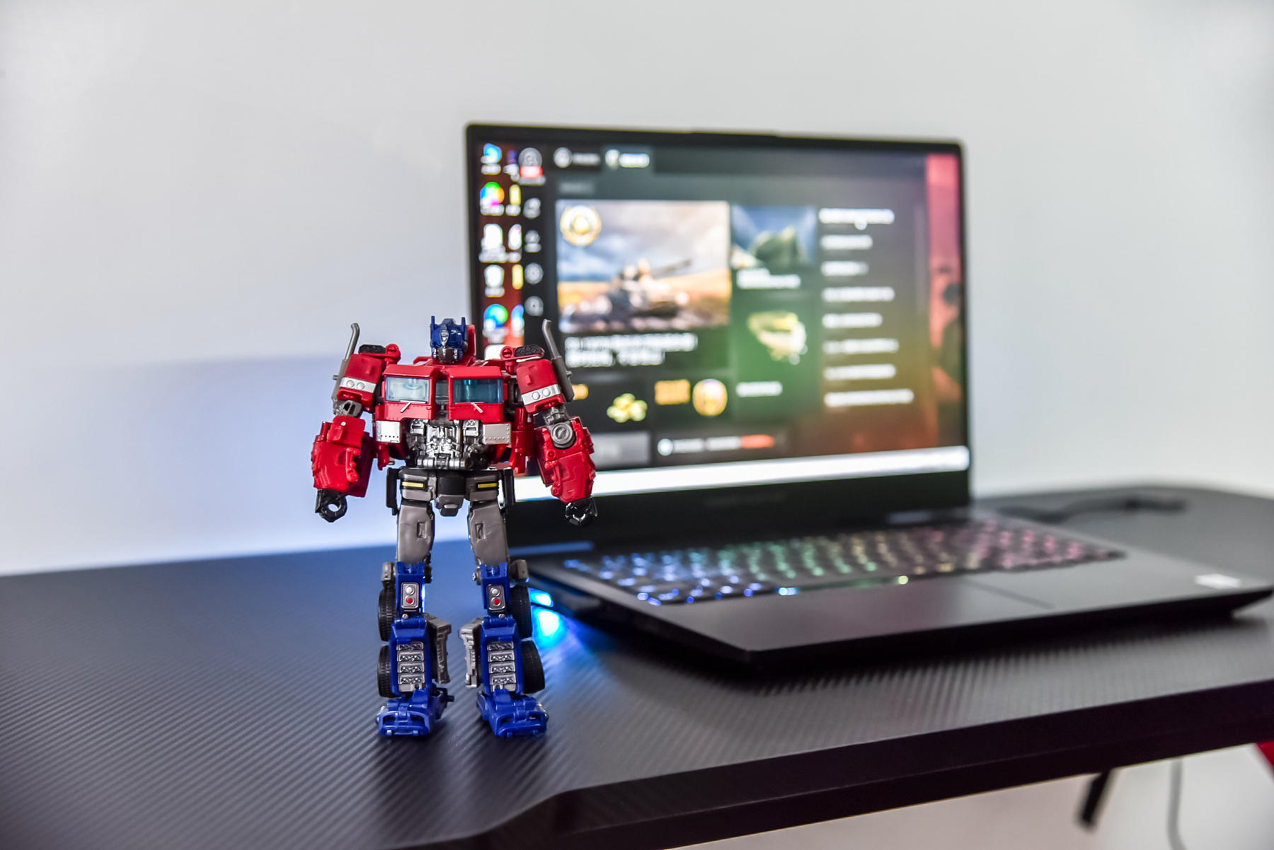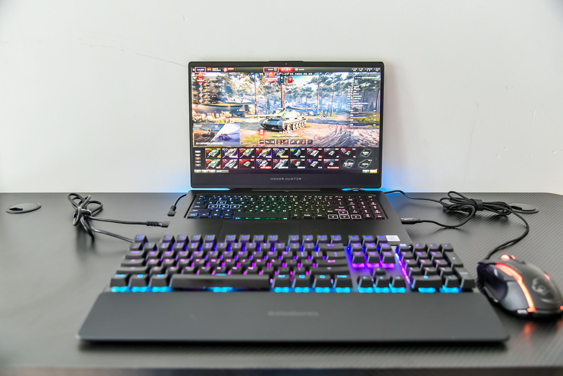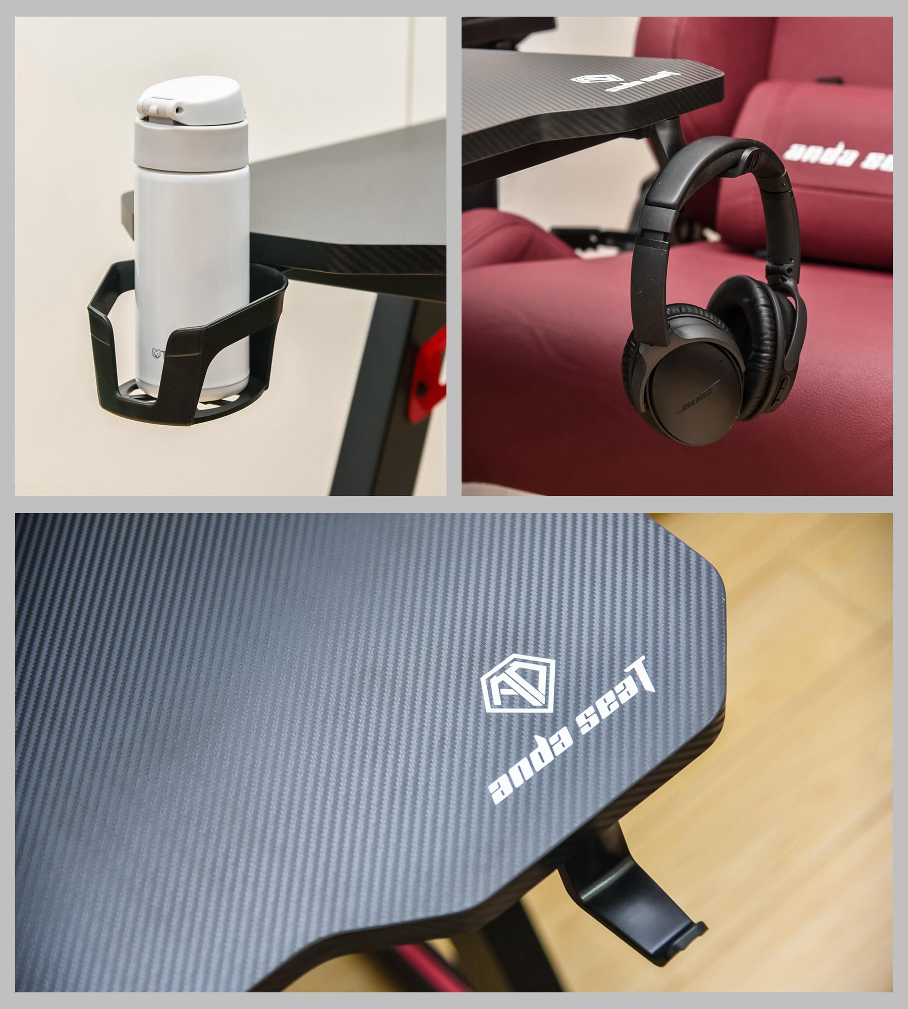 打游戏的时候,水杯放在侧面,也不用担心在机甲战士电竞桌上动作过大直接把水杯给碰倒,耳机收纳架则可以在不需要的时候把各种线材,耳机挂上去,需要的时候再直接拿起来用,方便快捷。桌面则是采用了P2级别的一个环保板材(P2是比我国国标E1更高一级的等级,算是目前人造木板中甲醛释放控制最为严格的一个生产标准),碳纤维纹理,不仅防滑还耐磨损,清洁起来难度也不高。