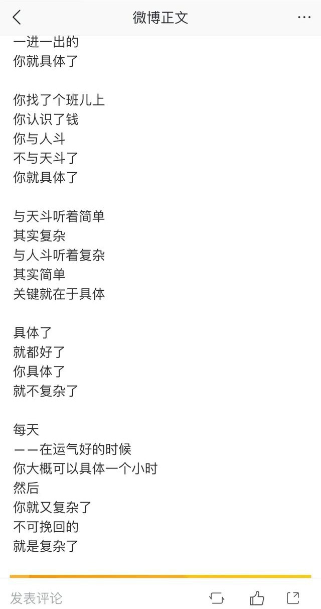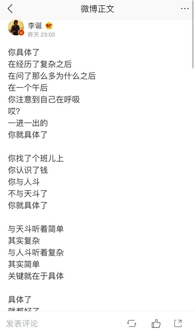 此次《吐槽大会》被停播,也激发了李诞的创作欲望,于是他写下了一首关于“具体”的诗歌。而这其中又具体表达了什么,估计每个读者都会给出自己的具体解读。