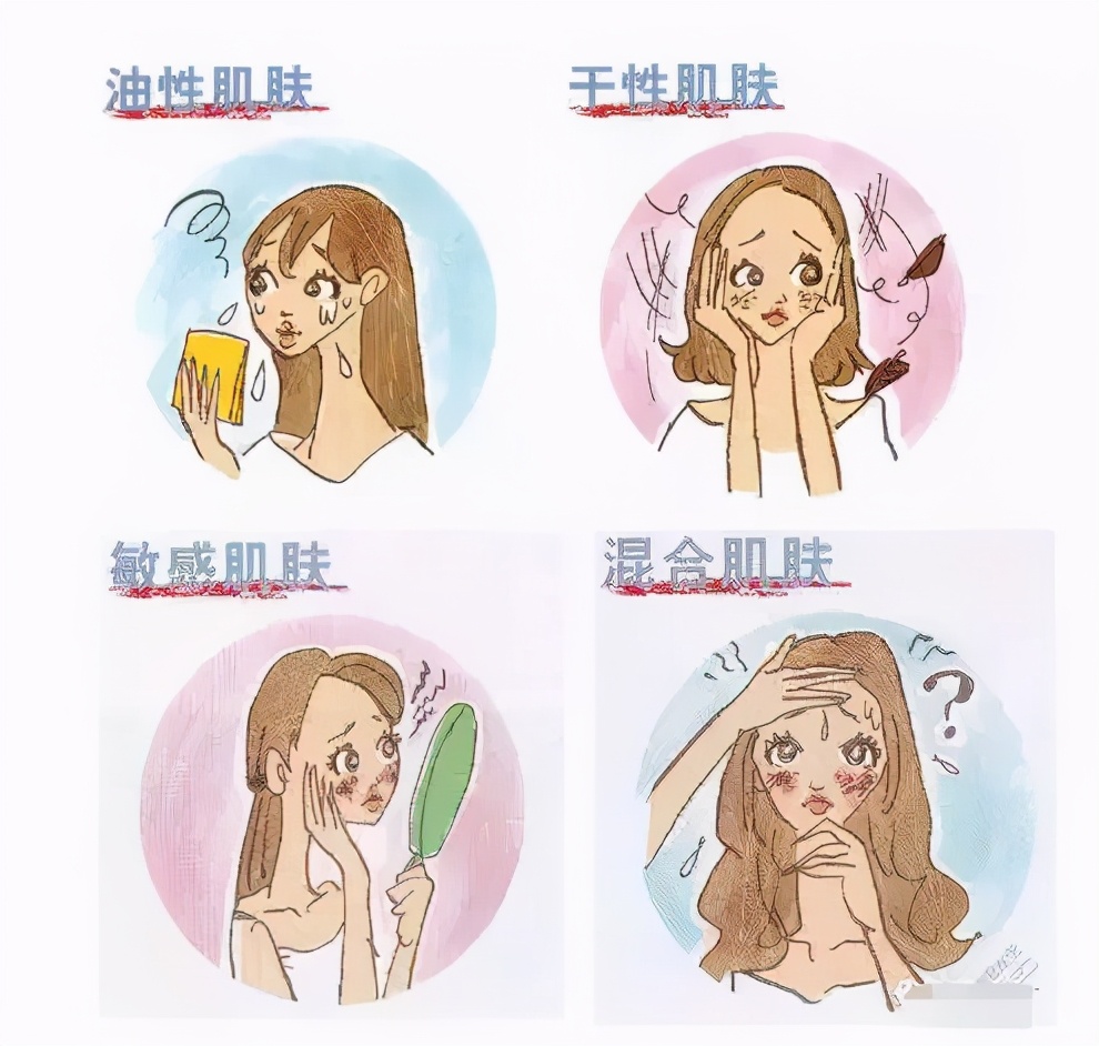 皮肤的基本类型:干性皮肤、中性皮肤、油性皮肤、混合性皮肤、敏感皮肤5种类型。这5种皮肤类型,又可以根据皮肤皱纹、色斑、暗疮、黑头、红血丝等症状,进一步细分。