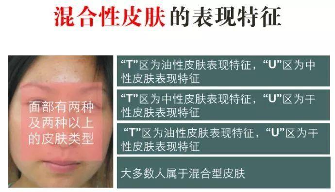 混合性皮肤兼有油性皮肤与干性皮肤的共同特性。临床常见的表现为额部、鼻部、口周、下颌部位油脂分泌旺盛,皮肤油腻、纹理粗、毛孔大,皮肤pH值较健康皮肤偏碱,容易滋生细菌,导致痤疮及黑头的发生,但患者感觉皮肤干,特别是面颊口周部常出现缺水皮肤表现,该肤质多见于25~35岁之间的青年人,中国大部分人都属于此类皮肤。