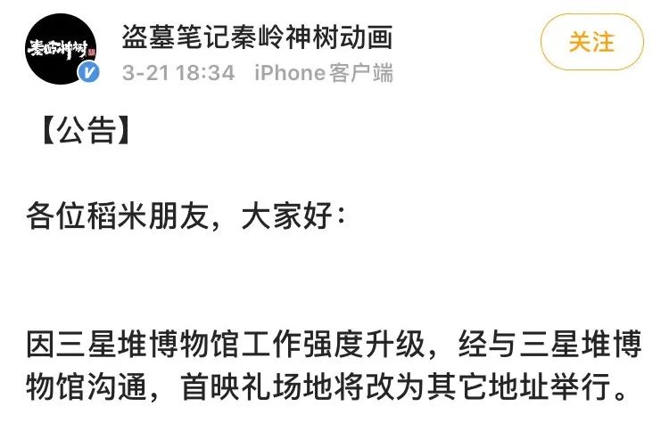 3月21日下午,该动画官博发出公告,通知首映礼改地举行: