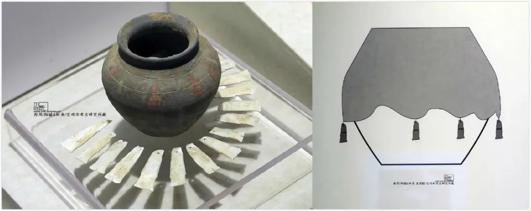 宝鸡旭光墓地M4的这件陶罐,在出土的时候周围散落了一圈的蚌制作的鱼。鱼都是清一色的嘴部向上,再根据相关的遗迹,专家们推断,在埋入墓中的时候,陶罐口是覆盖着织物的,织物四周缀着蚌鱼,用来防止灰尘。