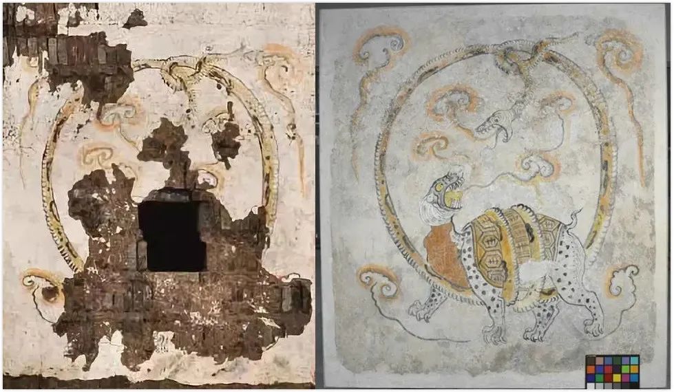 西安韩休墓的玄武图也是个例子,盗墓贼也仅仅是怀疑玄武图后有密室夹层,可能会有更值钱的金银财宝就立刻下狠手把脆弱的壁画给破坏掉了。工作人们拿着小到渣渣的千余块碎片,花费了一年时间才把玄武图重新修好,完全无法恢复的部分也在中间留着空白,没有做想象化的补笔。