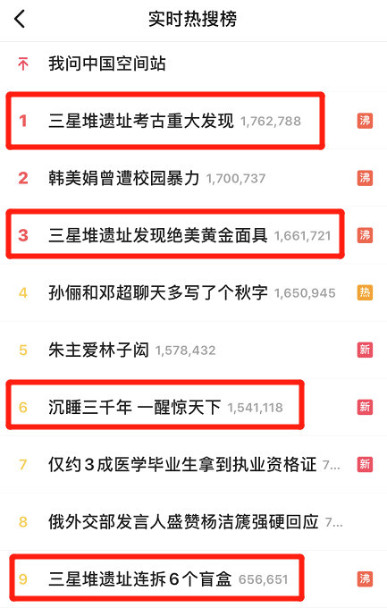 当日的微博热搜前十里有4个都在讨论三星堆,三星堆考古成了实打实的“顶流”。