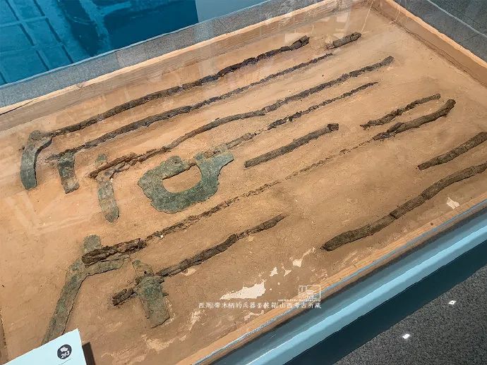 再比如山西翼城大河口墓地出的这个兵器套装箱,西周时期的,里面整齐的摆放着一组长柄武器,由于木质柄很脆弱,考古所直接采取了整体切割提取。只有考古才有这样,直接把这个1.44米宽,0.9米宽的部分直接提取,我们才有机会看到戈、钺等这些武器的摆放、绑系方式,才有机会看到不同武器的木柄部分都应该有多长。