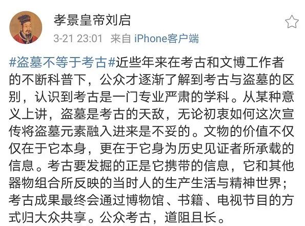 正如历史博主@几苇渡所说,“我们不必把考古神圣化,也不能污名化,更不要有意无意的把考古和盗墓放在一起去聊侃。”