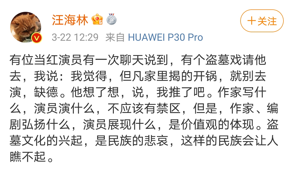 来自影视圈的著名编剧汪海林也发表了自己对盗墓文化的看法:
