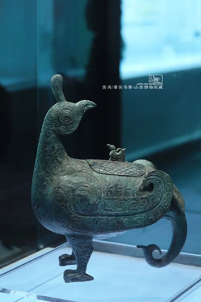 晋博最有名青铜鸟尊,就是在盗墓贼为了方便快捷盗墓而炸开墓室的时候被炸成了碎片,虽经过多年的修复,鸟尊的尾巴也仍失踪无寻,经过很多年的离散,近几年才在北大库房里重新发现,重新修复。(下图是修复前的,可以看到鸟尾巴上有一段光素无纹的,这就是第一次修复补上的)