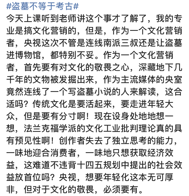 不少文博、考古爱好者都对央视此举感到十分愤怒,因为现在很多人还有着“考古就是官家盗墓”的错误想法,但盗墓是以窃取宝物为目的,对墓葬文化进行人为破坏的一种个人犯罪行为,而考古是以揭示古代文化真相和奥秘,以还原研究历史为目的的国家行动。