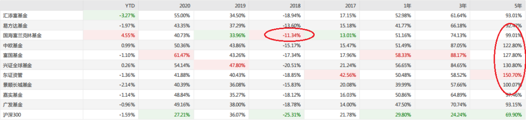 但同时,笔者注意到在2018年单边下跌的极端行情中,国海富兰克林基金以出色的熊市控回撤能力排在年度业绩榜单第一,这在上证指数跌幅-24.59%,沪深300指数跌幅-25.31%的2018年,这个业绩十分难得了。而看一年、三年、五年的数据,也基本排名靠前,熊市扛得住,牛市不掉队的特色非常明显。