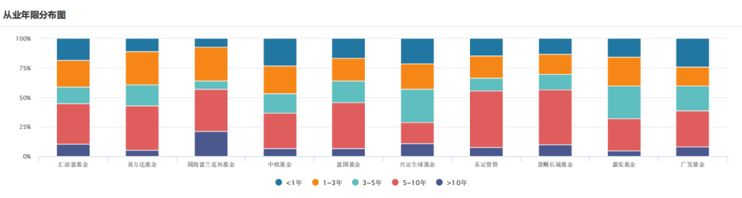 附:十家基金公司旗下基金经理从业年限分布图