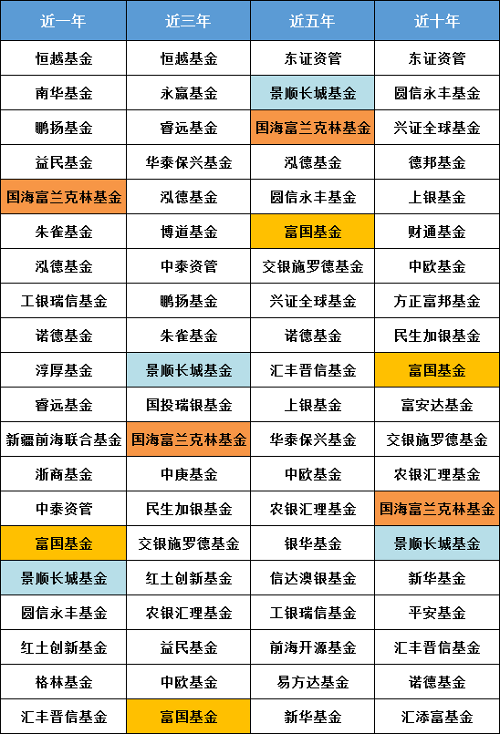 权益投资能力是基金公司的核心竞争力,下图是Wind统计的各家基金公司偏股型业绩指数,笔者筛选出近一年、近三年、近五年、近十年的偏股型业绩指数前20名的基金公司,仅有富国、景顺长城、国海富兰克林始终在列,展示了强大长跑能力。