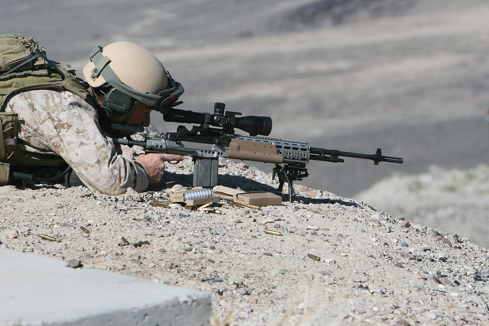 而海军陆战队后续参考过M14 EBR,打算要一款类似M14 EBR的准射步枪,但是最终换装的是M14 EMR。这个EMR英文全称是Enhanced Marksman Rifle,意思是增强型射手步枪,其实还是准射步枪。和之前的DMR相比,EMR更换了护木,更换了可调节的枪托,增加到四条M1913皮轨,目的是加装更多配件,又换了新的支架。