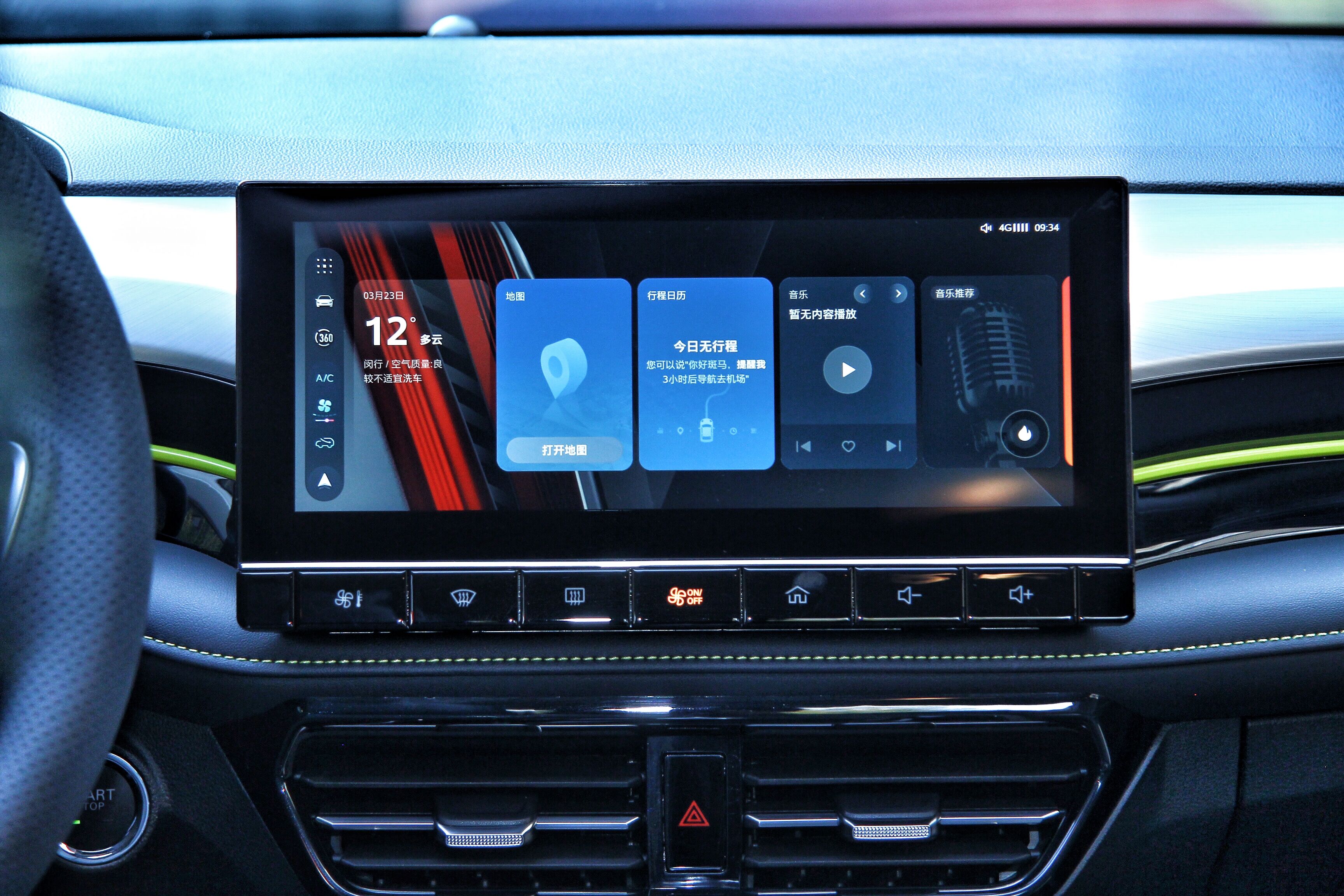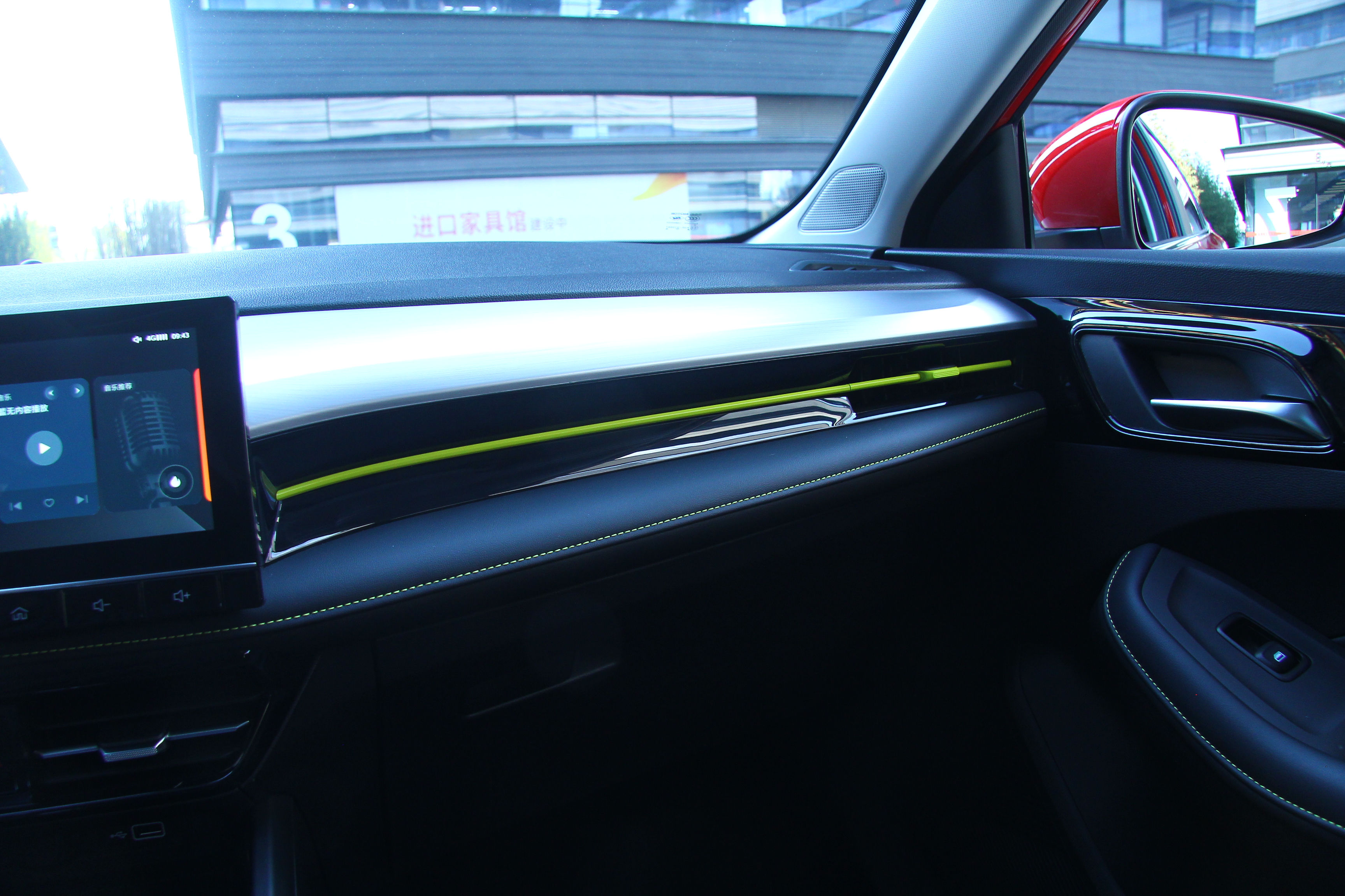 在同级车型中创新地采用了一体式隐藏出风口,加上荧黄色悬浮电镀饰条点缀,让整个IP台看上去纤薄、精致。