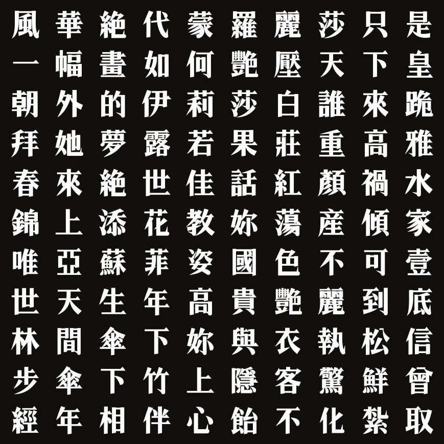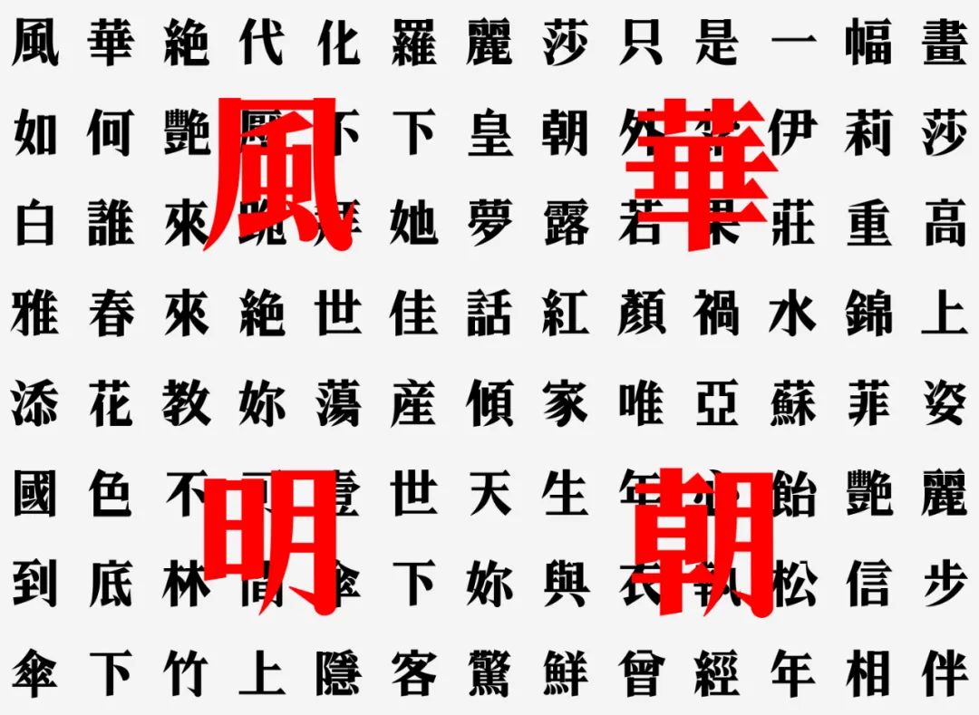 风华明体字型上参考了香港电影《花样年华》海报字型,并以60年代初旧上海美术字型为蓝本进行创作。字体保留了明体的气韵、优雅,增添了一份时尚感。整体字形设计得略偏修长,让字型在视觉上更加高雅时尚。