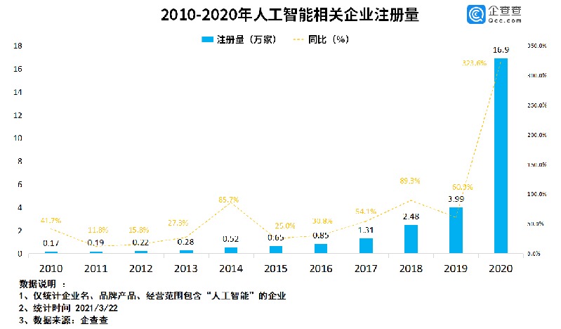 西安新闻网讯 专注于人工智能领域的百度日前回港二次上市,“AI第一股”受到资本市场热捧。3月24日,企查查数据研究院发布,截至3月,我国共有人工智能相关企业32.3万家,2020年全年新注册了16.9万家,同比增长323.6%。其中,陕西省以2.1万家人工智能相关企业位列全国第六。
