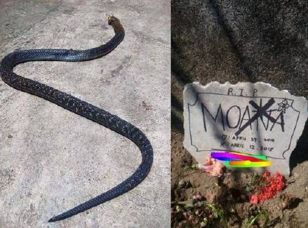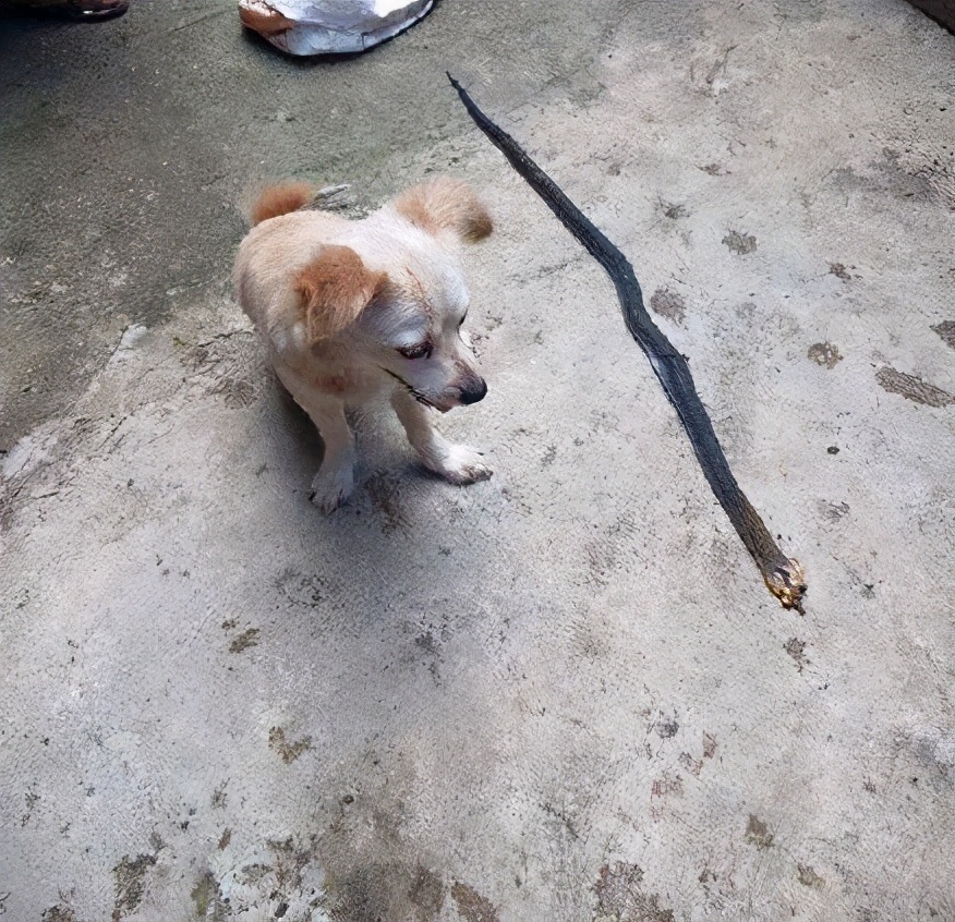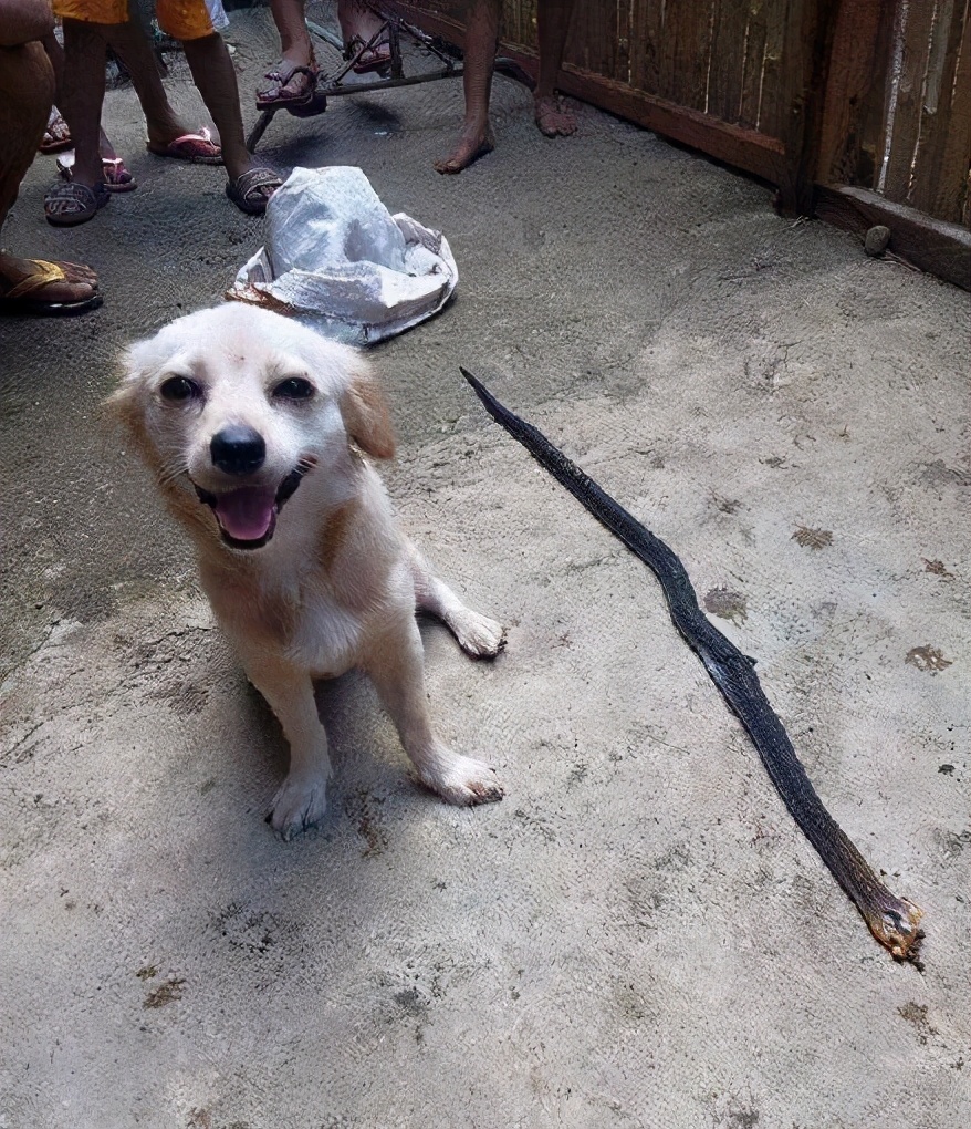 事情经过,一条蛇不知道从哪里爬了出来,因为街坊邻居的小孩子比较多,所以孩子们就感觉这条蛇特别好玩,故意戏弄它,但是这条蛇吐着蛇信,逐步开始攻击孩子们,孩子们这个时候才开始有点胆小,就在这条攻击小孩的时候,狗狗窜了出来,狗狗的牙齿咬了蛇好久才将这条蛇要死,看到蛇一动不动的,狗狗抬起头冲着大家笑了笑,狗狗救了这个小孩子!