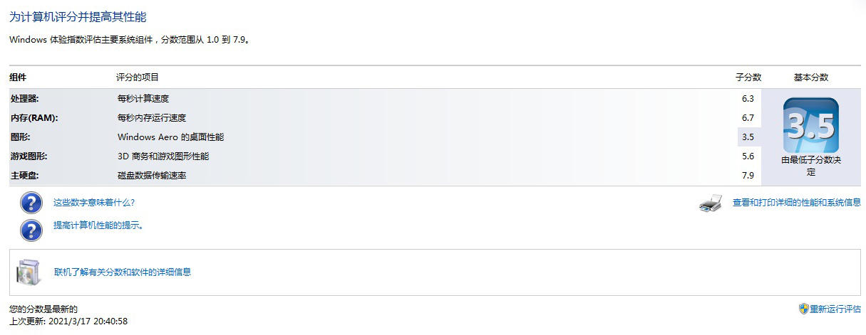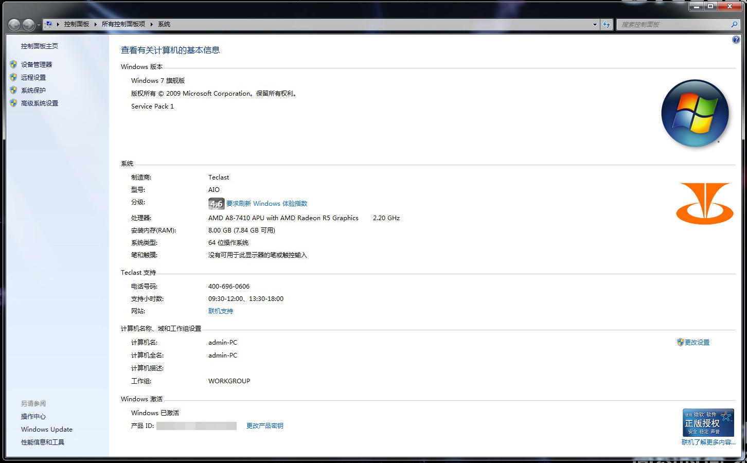 开机进入系统,通过查看系统基础信息可以看到,台电C24 Air A8C搭载了AMD-7410 APU处理器+8GB内存+64位Windows 7操作系统,Windows 7自带的性能评分3.5,在1.0~7.9的中部区间。