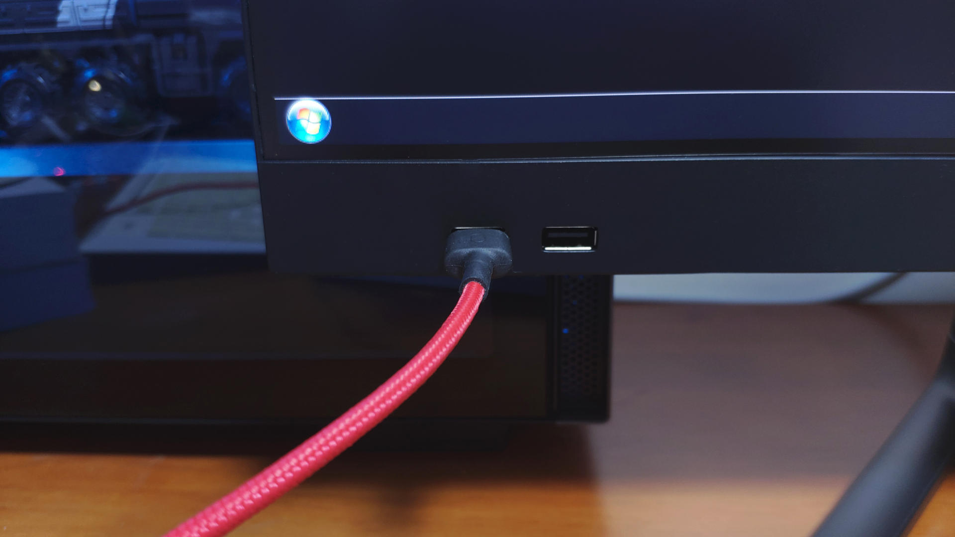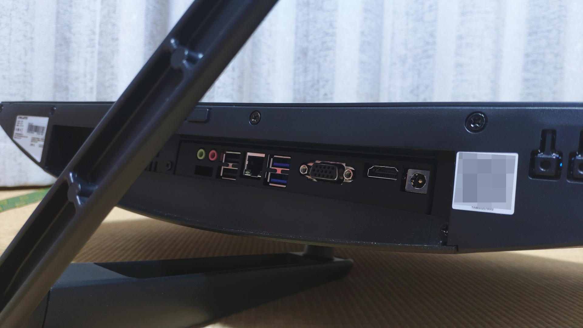 DC电源接口在机身下面板的接口区,接通就能开机正常用,不必额外连接别的线,此处还有HDMI接口*1(大概率是HDMI2.0)、VGA接口*1、USB 3.0接口*2、千兆RJ45网口*1、USB 2.0接口*2、音频接口*2,接口比较丰富。